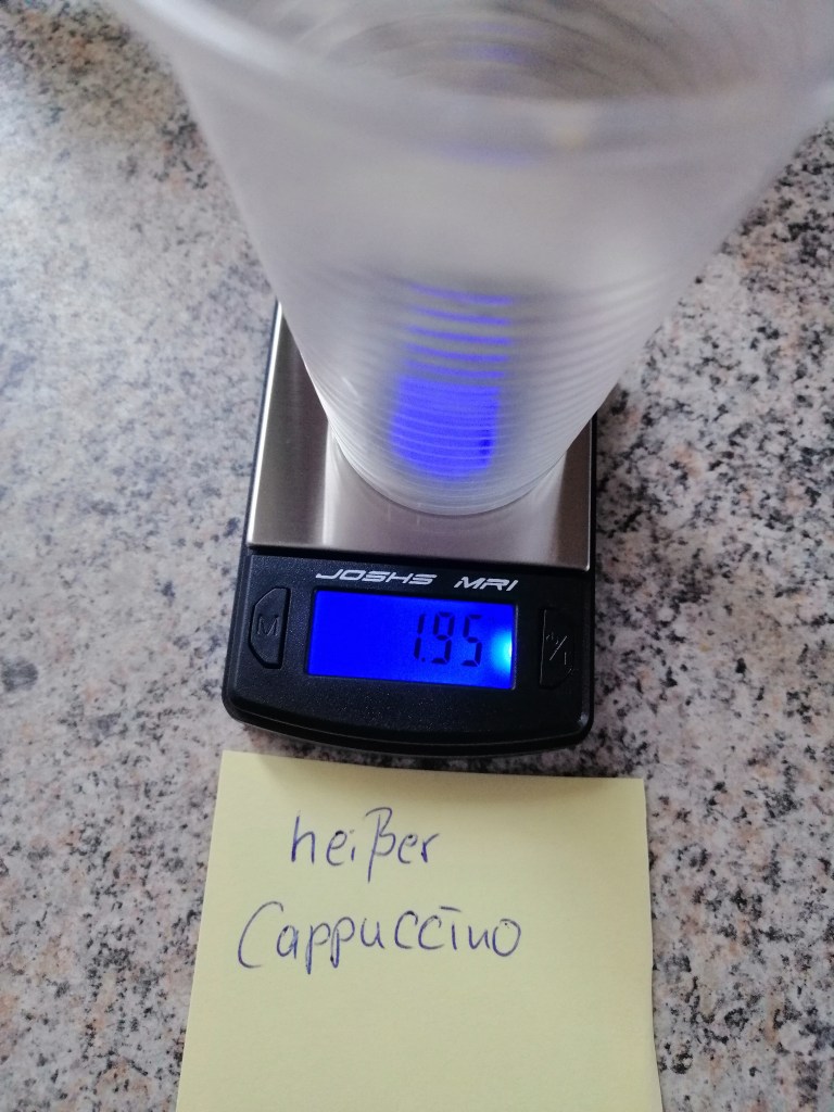 Eines Nachmittages brachte mir mein Mann einen Cappuccino in solch einem Becher. Dieser war so heiß, dass ich ihn erstmal etwas abkühlen lassen musste. Nachdem ich ihn geleert hatte, habe ich bemerkt, dass sich irgendetwas an dem Becher verändert hat. Er war noch labbriger als vorher und er knisterte auf einmal. Da kam mir die Idee, dass ich diesen benutzten Becher sowie einen Unbenutzten mal mit nach Hause nehme. Ich hatte bereits die Vermutung, dass der benutzte Becher eventuell leichter sein könnte, als der Unbenutzte, aber wie kann ich das nachweisen? Ich habe zwar eine Küchenwaage, aber die zeigt nur in Gramm-Schritten das Gewicht an und reagiert aber erst mit größeren Gewichten ab 10 Gramm genauer. Ich habe mir somit eine Waage besorgt, die in 0,01 Grammschritten misst.
