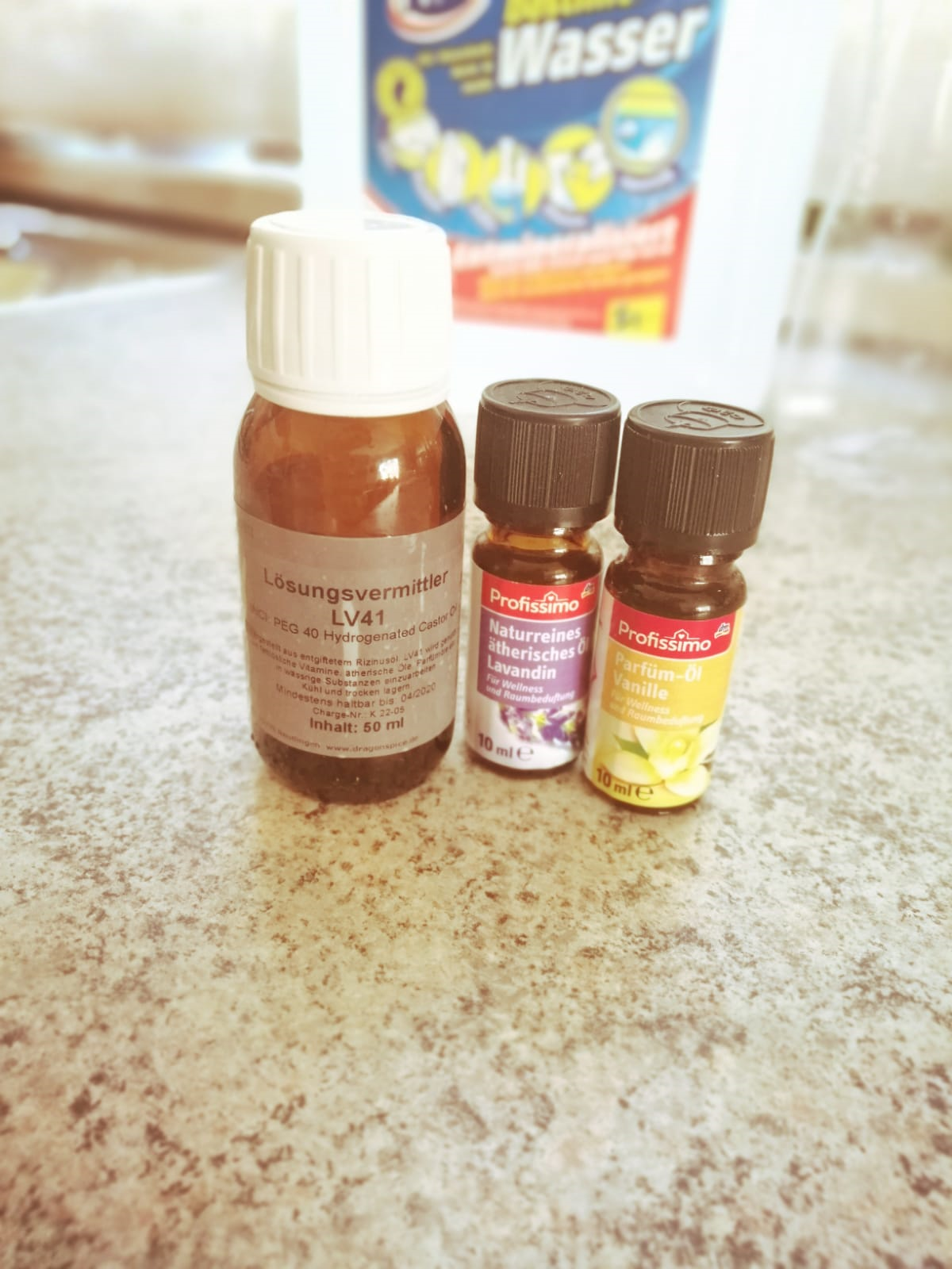 Da ich heute in Experimentierlaune war, habe ich gleich noch eine Flasche mit Wäscheduft (Grundanleitung von www.gesunex.de/waescheduft-einfach-selber-herstellen) angesetzt. Dieses ist hervorragend, wenn man seine Wäsche mit selbst hergestelltem Waschmittel (Pulver oder Flüssigwaschmittel) oder Waschnüssen wäscht und nicht auf einen angenehmen Duft verzichten möchte. Vorausgesetzt man reagiert nicht auf bestimmte ätherische Öle, dann bitte grundsätzlich darauf verzichten. Es wird hier seit ca. Oktober 2018 verwendet. Hierzu habe ich heute ca. 380 ml destilliertes Wasser in eine alte Waschmittelflasche (Altes ruhig wieder verwenden, vor allem wenn es aus Plastik besteht) gefüllt. Dazu kommen 2 bis 4 ml LV 41*. Das ist ein Lösungsvermittler, hergestellt aus entgiftetem Rizinusöl. Dies sorgt dafür, dass die ätherischen Öle sich mit dem Wasser vermischen. Ohne den Lösungsvermittler würde das Öl an der Wasseroberfläche schwimmen und das ganze würde absolut keinen Sinn machen, da man das ganze Öl mit der ersten Waschmaschine verbrauchen würde und später nur Wasser hinzufügt. Allerdings sollte man die Flasche dennoch vor jedem Gebrauch einmal schütteln. Ich habe mich dieses Mal für einige Tropfen Lavendelöl (hilft gegen Motten, obwohl ich noch nie welche in der Wäsche hatte und für die desinfizierende Wirkung) und einige Tropfen Vanille-Öl für einen süßeren Duft. Für die Dosierung des Wäscheduftes ist die eigene Nase Maßstab. Es gibt Leute, die mögen es eher dezent und für andere kann Viel kaum genug sein. Am besten testet man sich selbst durch. Der Wäscheduft kommt in das Weichspülfach der Waschmaschine. Mit einem kleinen Spritzer beginnt man und dann kann man sich langsam steigern mit jeder Wäsche, bis man seine eigene Duftintensität gefunden hat. Allerdings sollte man auch wissen, dass es nicht vergleichbar ist mit den hergestellten stark chemischen Produkten aus dem Supermarkt, bei denen die Werbung einen Duft von vielen Wochen suggeriert. Der Duft verfliegt schon nach einiger Zeit, aber ist ökologisch gesehen dennoch die bessere Variante. Das schöne ist, dass man sich selbst schöne Düfte kreieren kann. Einfach mal mutig sein.