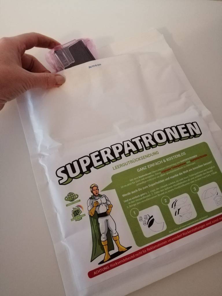 Die nächste Überraschung war, dass sich ein Rückumschlag mit in dem Paket befand. Somit können die leeren Patronen gleich eingetütet werden und DIREKT wieder zu dem Superpatron gesandt werden.